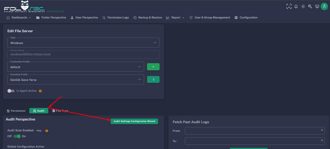 Configuration>File Server Configuration>We are making an edit of the File Server added to FolSec, click the Audit Settings Configuration Wizard button from the audit section.
