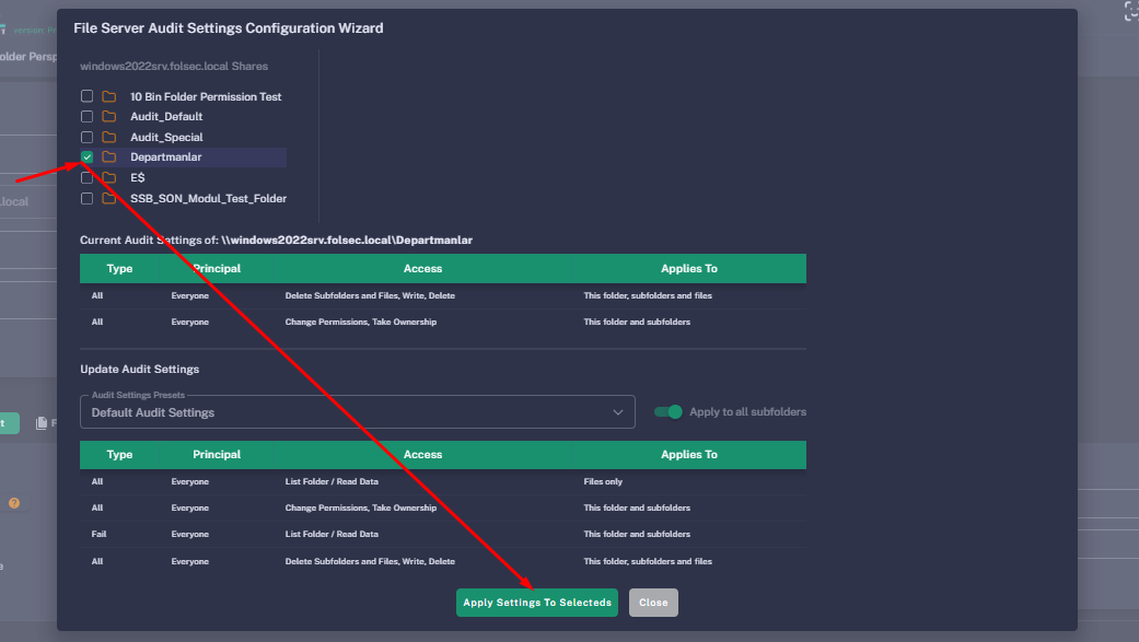 If we are going to set up a file audit in which folder, we select the folder and click on the "Apply Settings To Selecteds" button. FolSec sets up folder audits for us on our behalf.