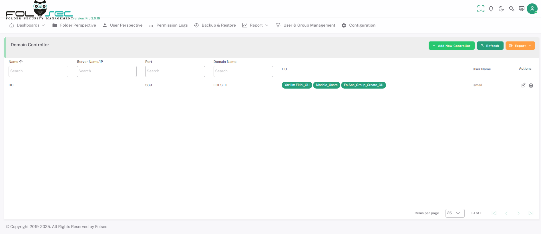 FOLSEC's Domain Controller menu plays an important role in file server management. You can add multiple domains through this menu and the process of bringing users and groups of certain OUS (Organizational Units) to the FolSec screen can be performed. This makes it possible to better analyze and manage the structure in Active Directory.