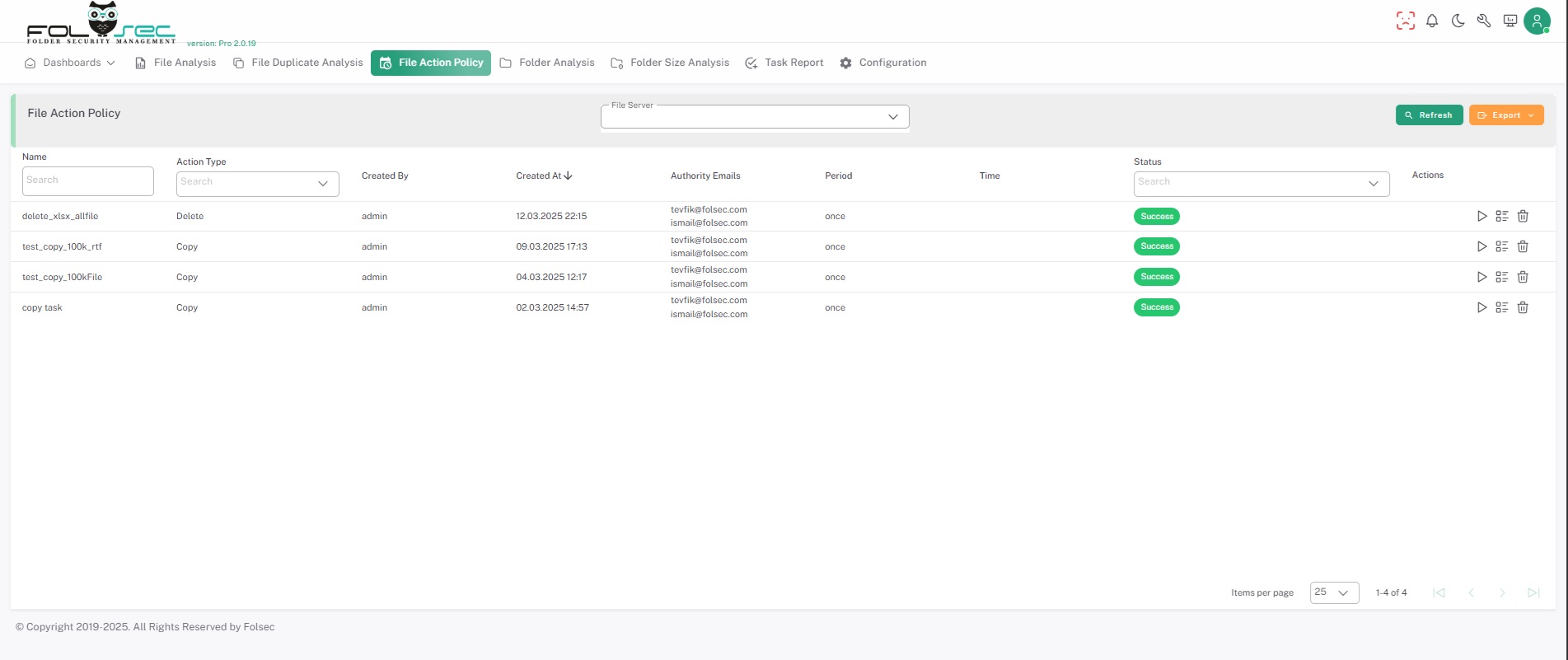 FOLSEC's File Action Policy menu is an approval mechanism that allows important decisions to be made about file analysis operations. In this menu, the processes are started by approving the file actions created in the File Analysis menu. However, a minimum of two users must give their consent for these actions to start. This feature provides an additional layer of security in terms of security and process control, providing protection to prevent an individual user from making incorrect or unauthorized transactions.Oct.This menu helps to safely execute high-risk or critical operations, especially on file servers. After receiving the user's approvals, the specified actions (such as deleting files, moving, changing permissions) are activated, and system administrators can easily track these operations.
