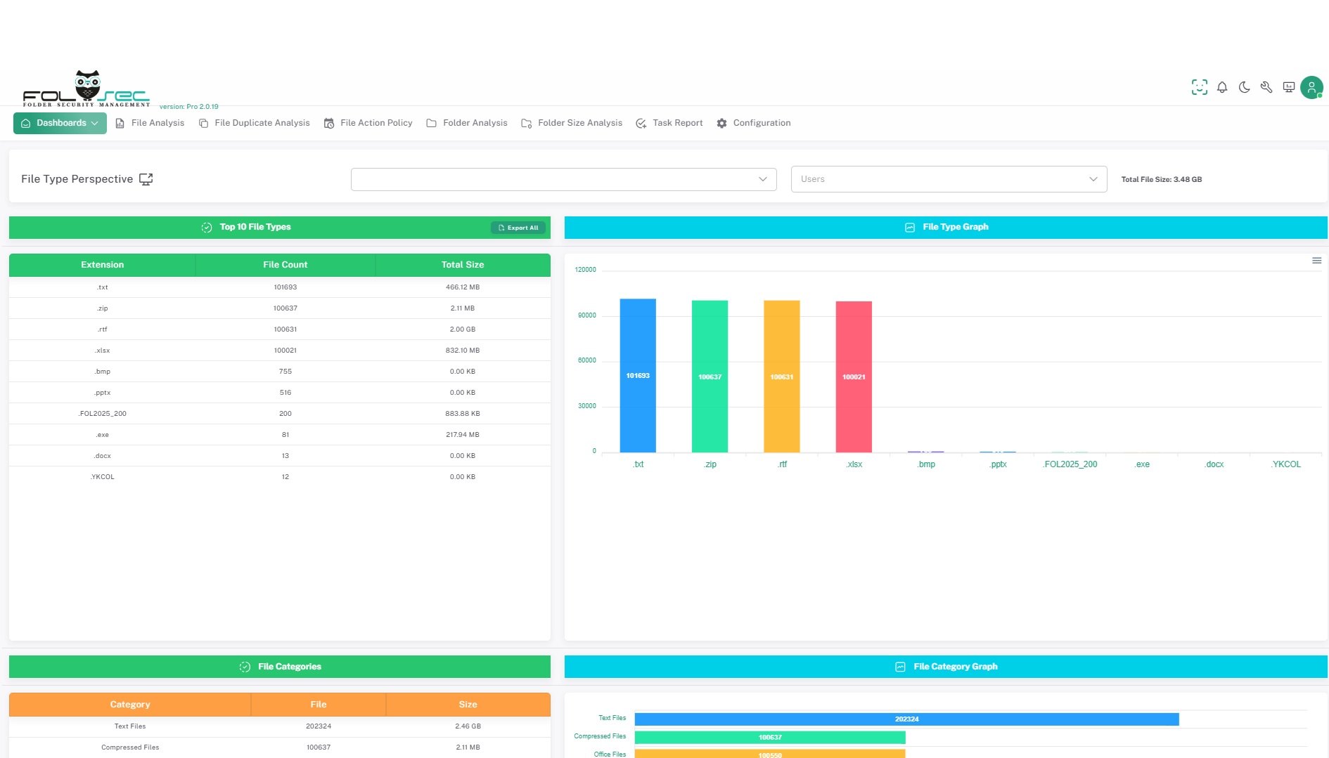 Visualization of File Types: The data obtained after scanning are shown in graphs by numerical and dimensional analysis according to file types. This allows you to instantly see which file type takes up more space on the system and the most commonly used file formats.Category-Based Analysis: Files are analyzed by dividing them into categories. Categories such as office files, text files, system files, ransomware files are shown in separate graphs for each of them. In this way, you can easily understand which category of files are more common in the system.Number and Size Based Charts: It is possible to track both the numbers and sizes of file types with two different charts. This helps you to understand not only how many files there are, but also how much space these files take up on the system.User-Friendly Schema: Graphs and schemas are designed in a simple and understandable way so that the user can easily perform analysis. Visuals allow you to perform file analysis quickly and effectively, reducing data density.Optimization of System Resources: Visualizing the file types that take up space on the server helps you understand which files use up system resources and how much. In this way, you can detect and clean up unnecessary files, optimize system performance.FOLSEC's File Type Perspective Dashboard display is an effective tool that facilitates the analysis of file types on the server after scanning. While the numbers and sizes of file types are presented with visual graphics, it allows you to perform a more detailed analysis by categorizing the files. Thanks to this screen, you can manage the file structure on the server both efficiently and evaluate it in terms of security and performance.