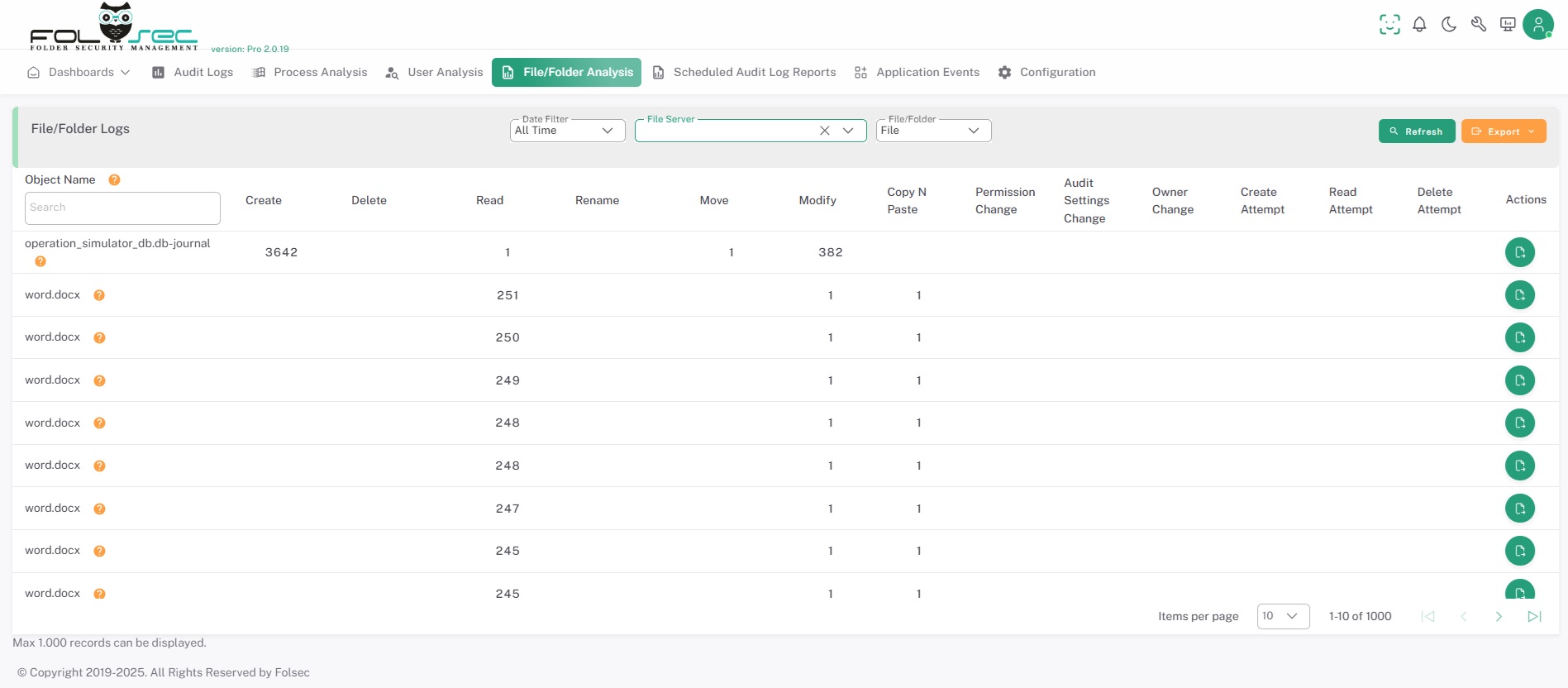 FOLSEC's File/Folder Analysis menu provides the opportunity to view and report in detail what kind of event logs are generated in which file or folder on the file servers. System administrators can perform all operations that take place in certain files and folders (for example, reading, creating, deleting, etc.) they can easily follow. When clicking on the logs generated in the relevant file or folder, they can be redirected to the Audit Logs screen and displayed in detail by which user or process these logs were generated.This analysis menu plays a major role in detecting potential vulnerabilities and monitoring file movements, while making the activities on file servers more understandable. Managers can make detailed analyses and create reports by exporting this data in CSV format.