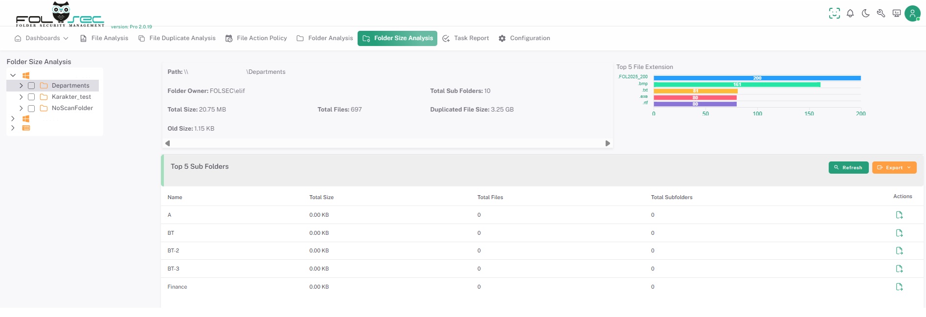 Folder Size Analysis is an effective tool used to analyze the size and contents of selected folders on the scanned file server in detail. This menu provides users with the following important information: