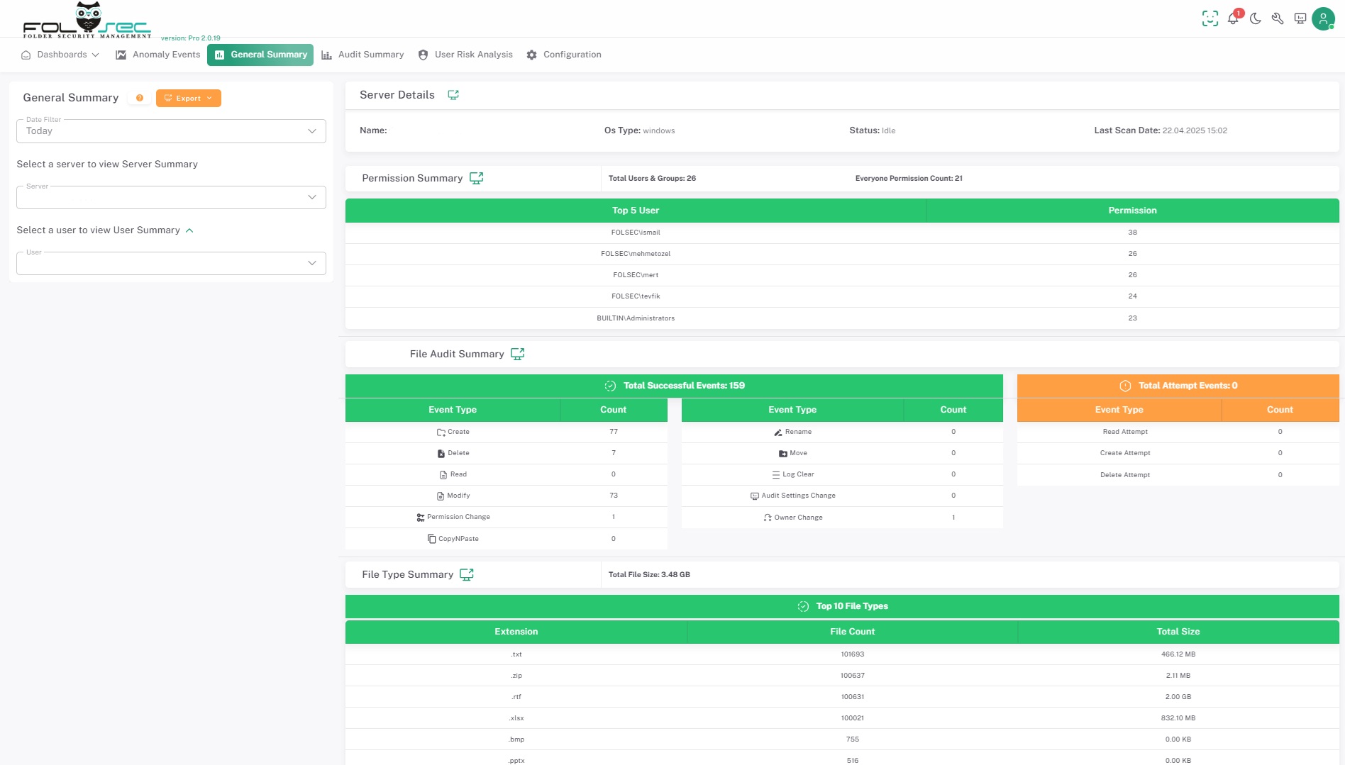 The General Summary menu is a screen that provides an overview of the four main perspectives of FOLSEC. This menu Deconstructs the most important data on the selected file server and provides a comprehensive analysis. Users, users and groups with top 5 rights can see the number of total event logs on the file server, the number of attempt logs, the top 10 file types available on the file server, and the top 5 anomaly event that has occurred in detail on this screen.The General Summary menu provides the most critical information on the system in one place, allowing you to make more effective decisions in file server management. You can optimize server performance by analyzing both security-important events and file types and user activities.