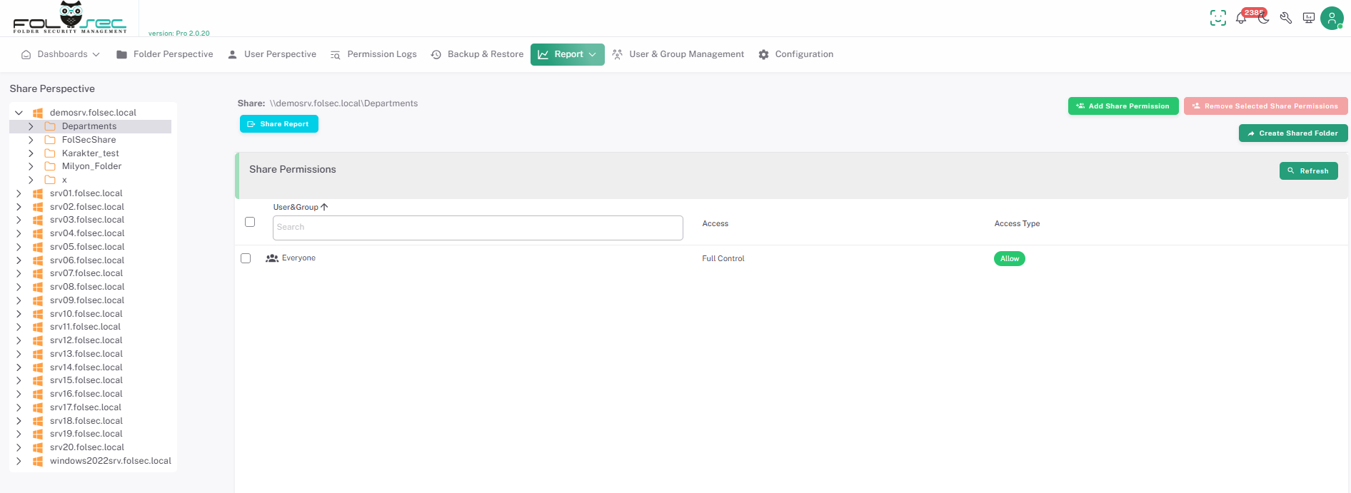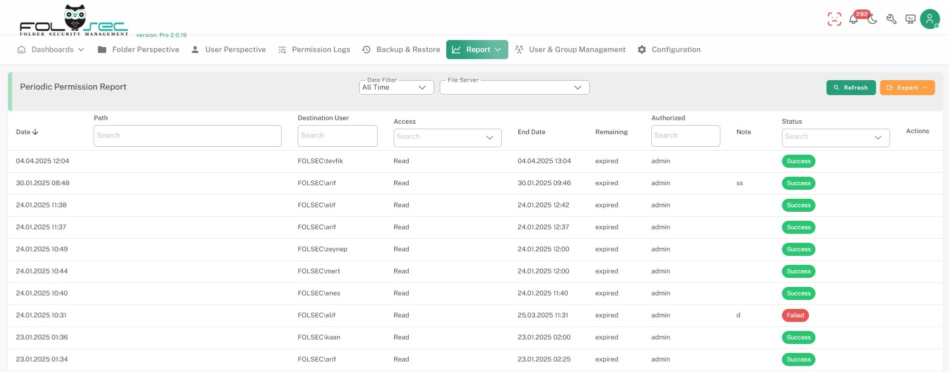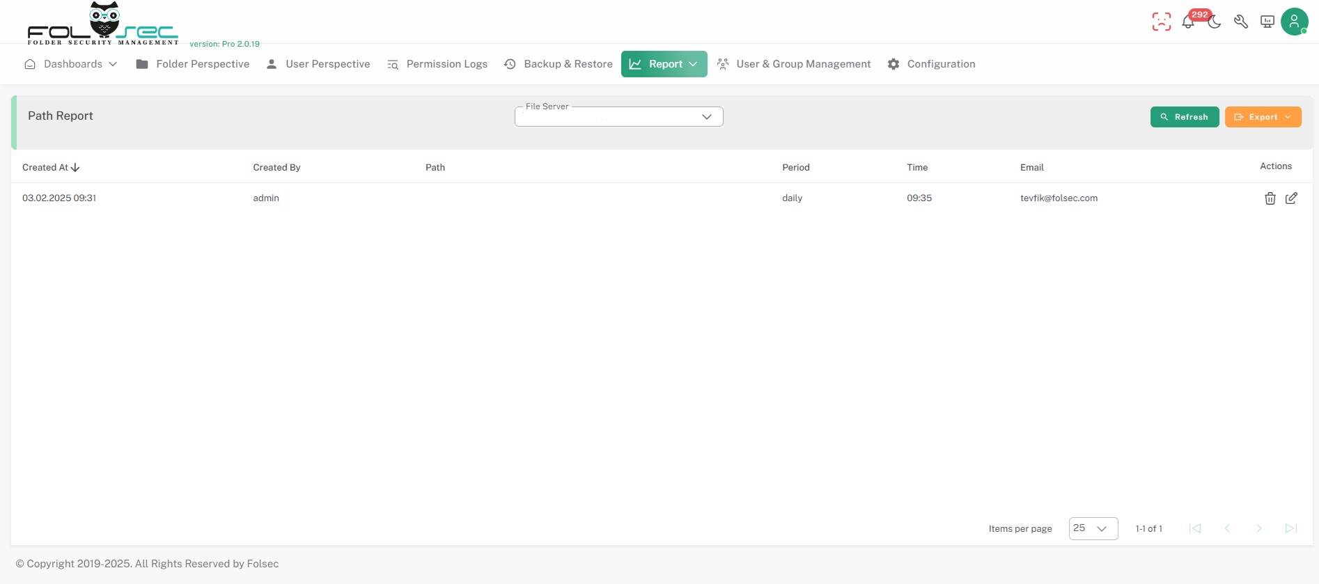 Path Raporu: Allows you to view scheduled (scheduled) reports in the Folder Perspective menu. This feature allows you to examine in detail the permissions and access levels on certain routes. It clearly shows which permissions users and groups have in which folders. These reports, taken from a folder perspective, allow you to effectively manage access permissions on your system.