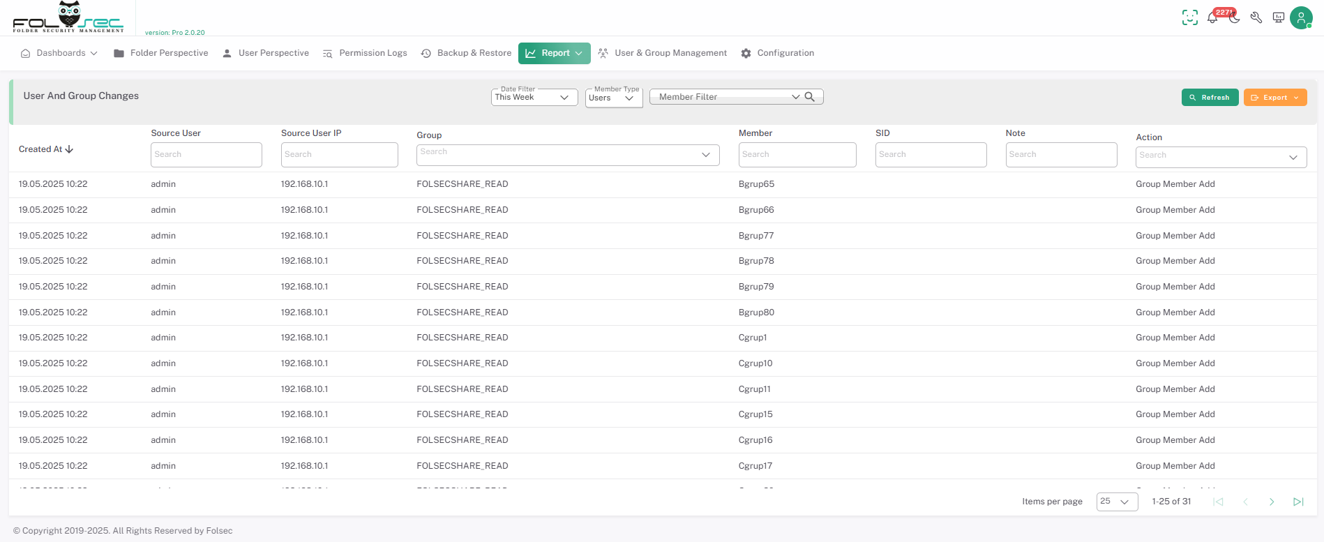 User And Group Changes: You can view and report user or group changes (such as user deletion, adding group members, etc.) through FolSec or AD via FolSec.