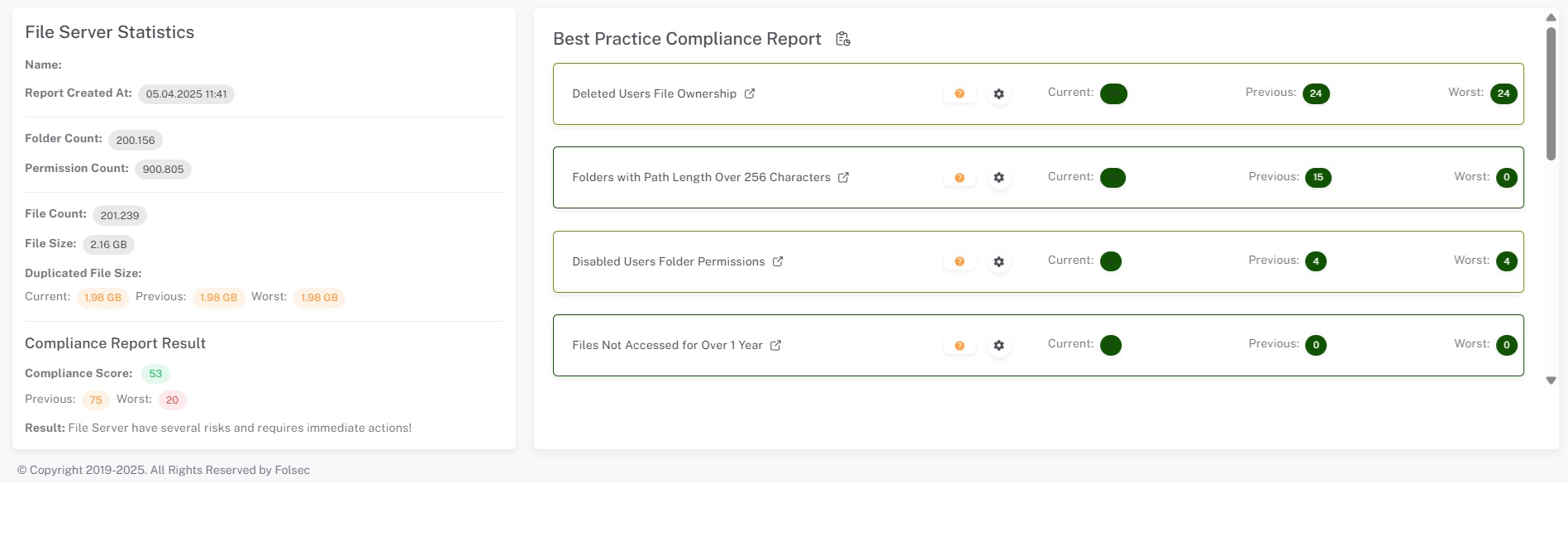 Compliance Report: With the File Server compliance report, you can view and report how compliant the file server managed through FolSec is with Best Practices rules.
