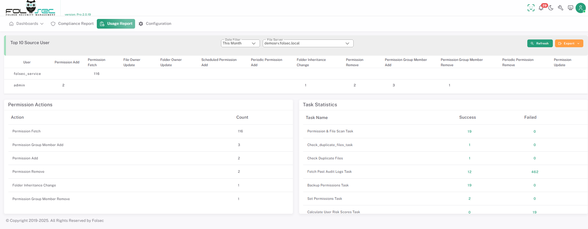 Usage Report: This is the screen on FolSec where the number of actions taken and the status of executed tasks are reported.