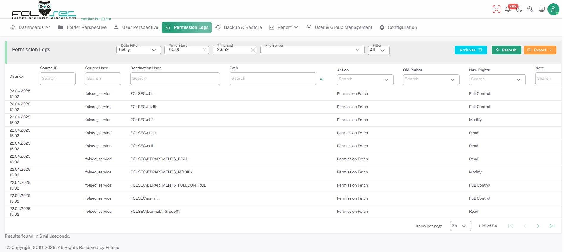 FOLSEC's Permission Logs & Restore menu helps you manage your NTFS permissions more effectively and securely. You can increase your data security and simplify your administrative processes by tracking granted permissions, visibility of authorization details, revoking incorrect permission settings, and monitoring group changes.