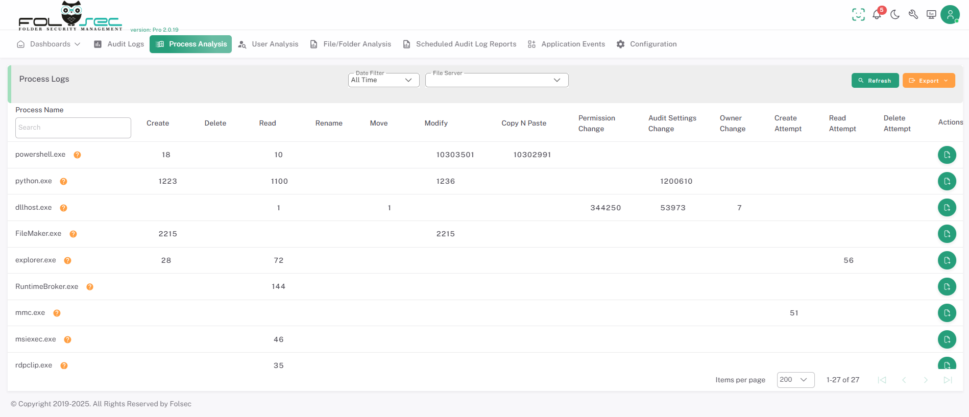 FOLSEC's Process Analysis menu provides the opportunity to view and report in detail what kind of event logs are generated by processes running on file servers. Through this menu, system administrators can determine which operations a particular process performs (for example: read, create, delete, etc.) may follow. Process Analysis provides administrators with the convenience of examining process movements in depth, recording all events that are important for security, and reporting this information. This feature plays a critical role in detecting security threats early and taking proactive measures against possible breaches.