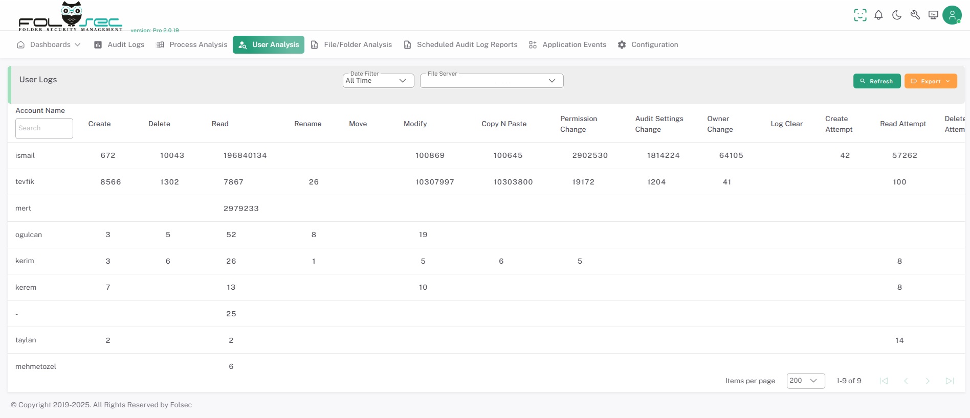 FOLSEC's User Analysis menu provides system administrators with the opportunity to see and report in detail which user created what types of event logs (for example: reading, creating, deleting). In this menu, system administrators can list and analyze all the operations that users perform on file servers. In addition, when clicking on the logs generated on a user basis, they can be redirected to the Audit Logs menu and examine the log details in more detail.This menu is a critical tool, especially for monitoring user activities, early detection of security incidents and prevention of data breaches. In addition, system administrators can export these logs in CSV format and include them in detailed analysis and reporting processes.